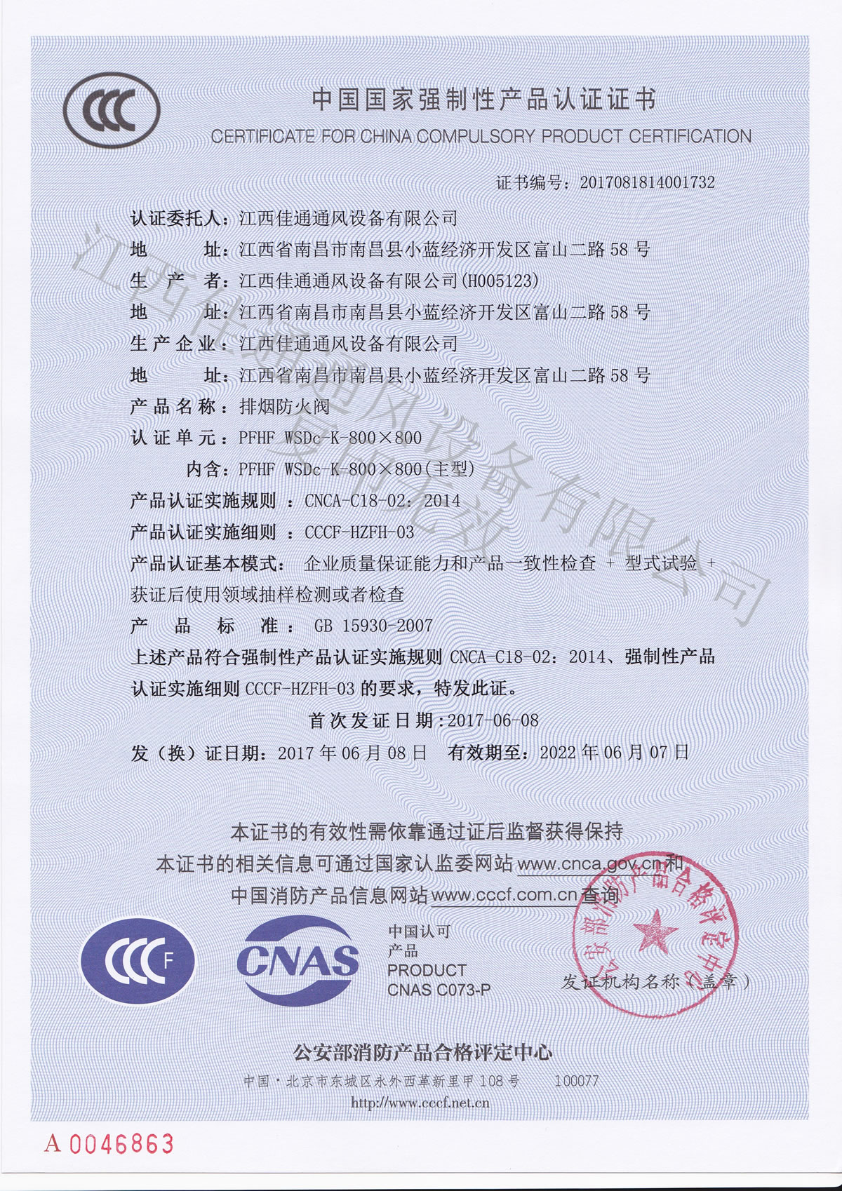 PFHF WSDc-K-800×800 排烟防火阀3C认证证书